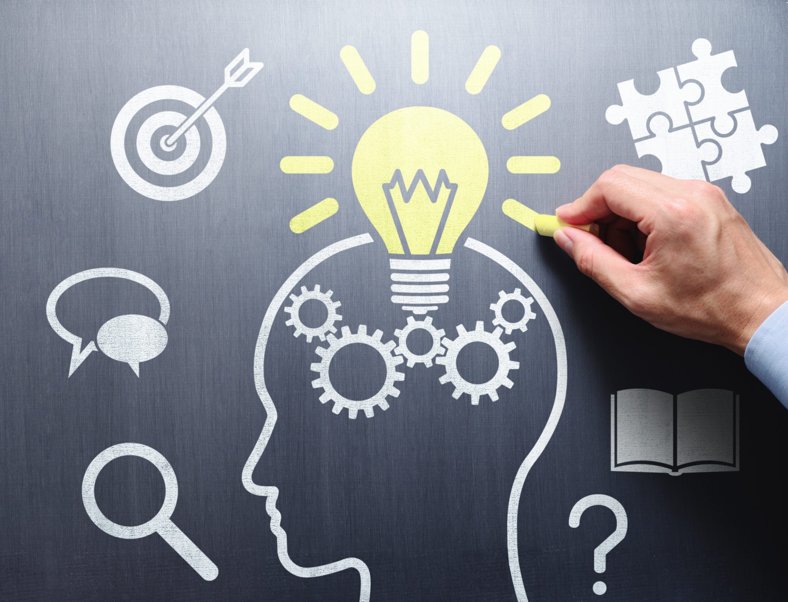 Knowledge and inspiration. Drawing lightbulb and head silhouette on chalkboard.